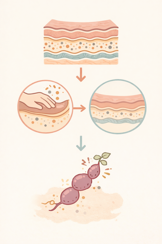 長年の無理で固まった古いコリを一層ずつ緩めて、尿や便、汗として体の外へ流し出します。排水管の詰まりを取るようなイメージです。