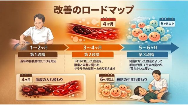 症状が軽くなり「治った!」と錯覚しやすい時期です。しかし、血液が変わっただけで細胞はまだ古いままです。ここで無理をしたり通院をやめると、すぐに元の詰まった状態に戻ってしまいます。