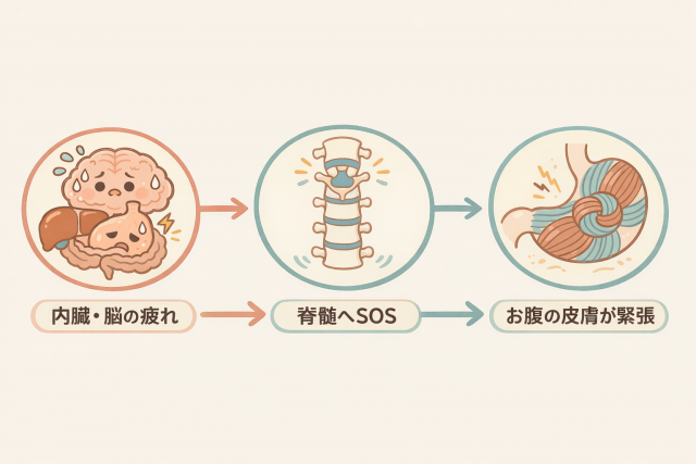 普段のストレスや脳・内臓の疲れが自律神経を通じて脊髄に伝わり、お腹の皮膚を無意識にギュッと緊張させているのです。